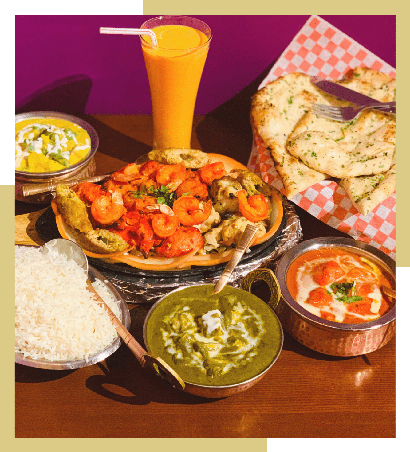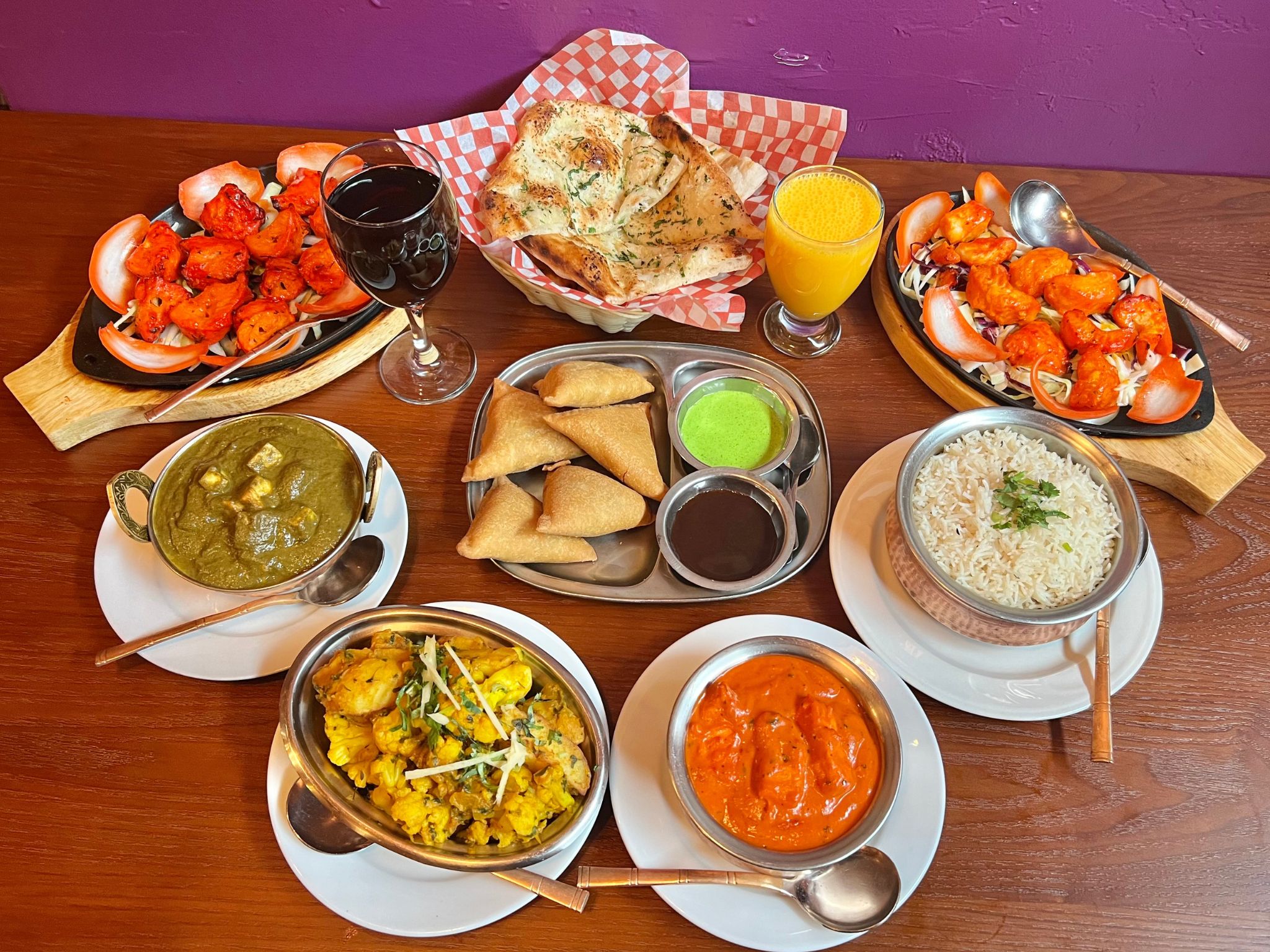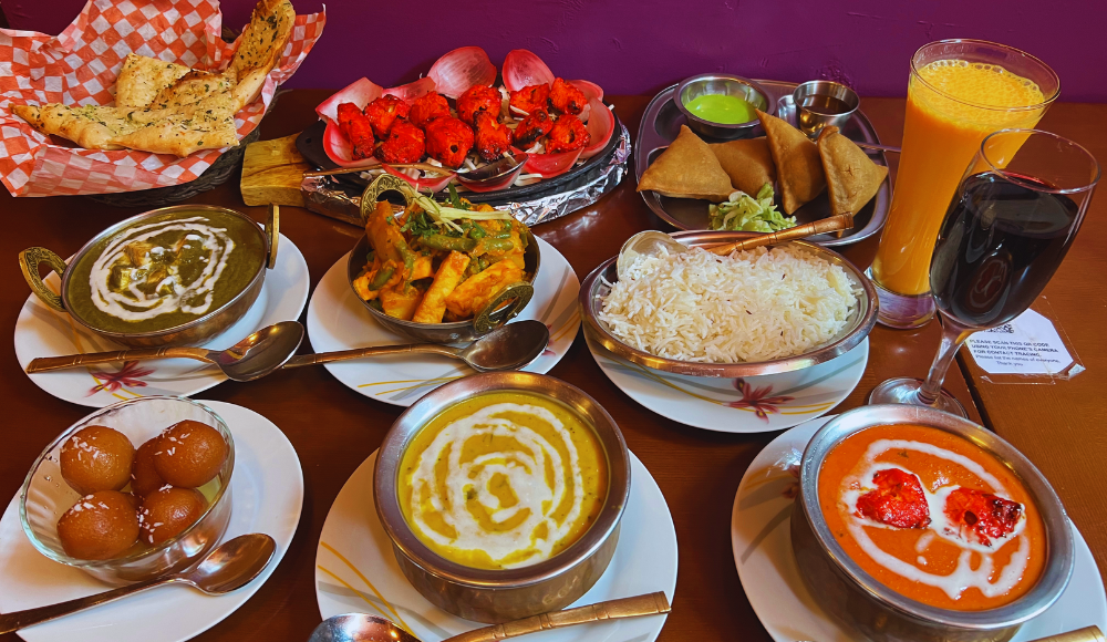 includes rice, naan, chana masala, mutter paneer, choice of butter chicken or lamb